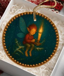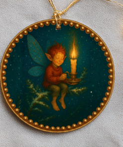 A hand-painted-feel ceramic ornament that brings a quiet, storybook warmth to your holiday decor. This heartwarming scene features a cheerful pixie holding a glowing candle, symbolizing joy and small acts of kindness that brighten the cold season.